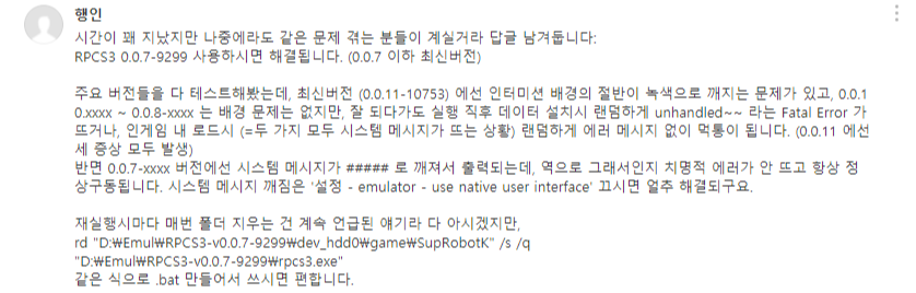 재실행 할때마다 dev_hdd0\games\SupRobotK 폴더를 삭제하고 실행해야한다네요