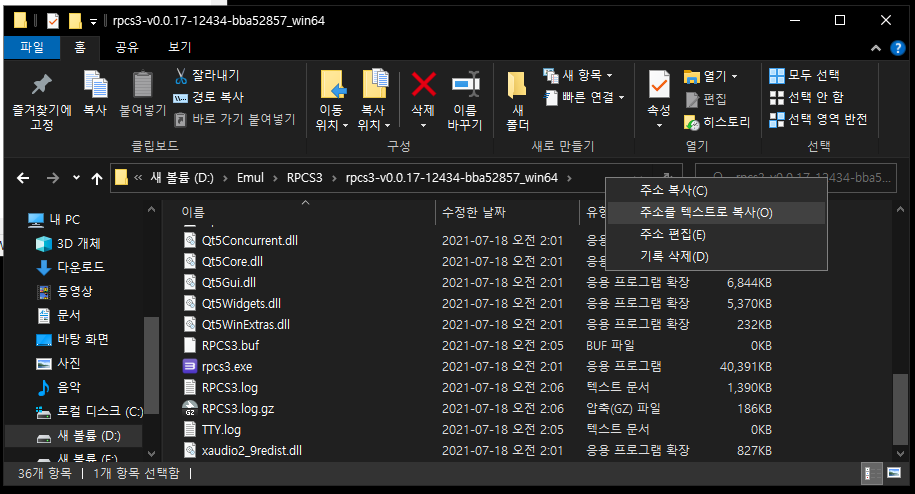 rpcs3.exe가 있는 폴더로 가서 '주소를 텍스트로 복사' 클릭합니다