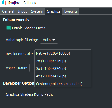 Resolution Scale은 게임 중에도 변경가능하며 Cutsom으로 360p( 0.5x,Handheld ) 등 화질을 낮출 수도 있습니다
