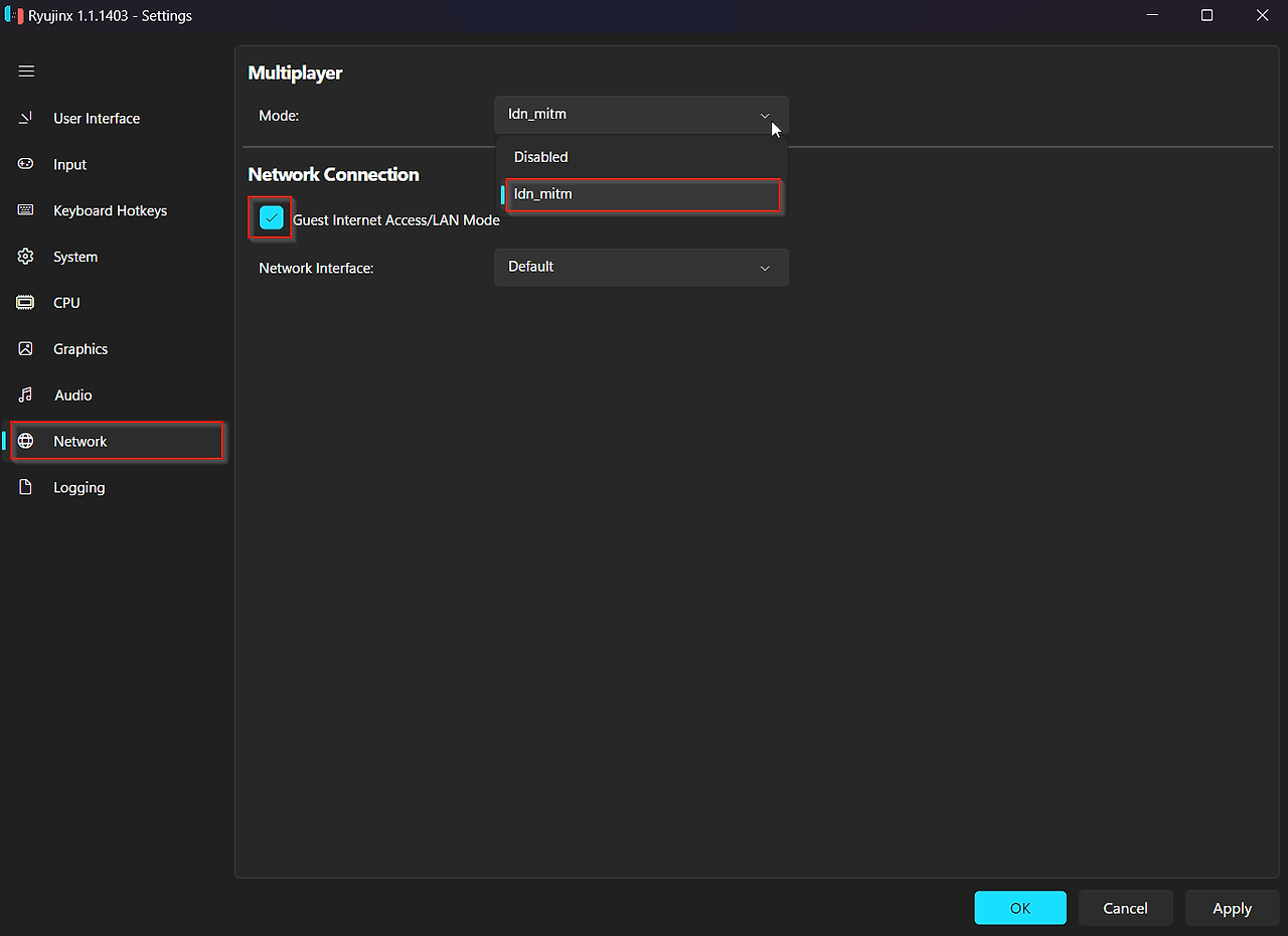 최신 Ryujinx 빌드에서 LDN을 설정하려면 Options > Settings > Network로 이동하세요.