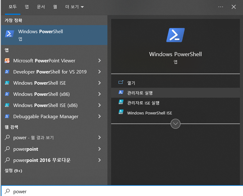 1. node , npm 명령어 사용을 위해 윈도우키를 눌러 'powershell' 검색
