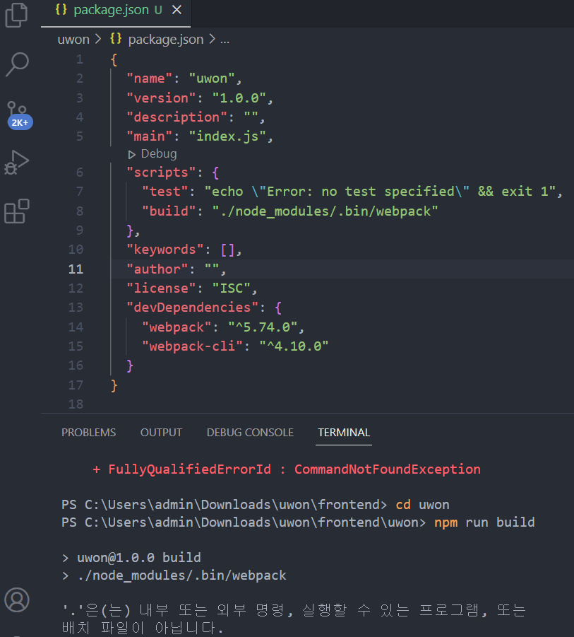 b. "scripts": { "build": "./node~..webpack" }