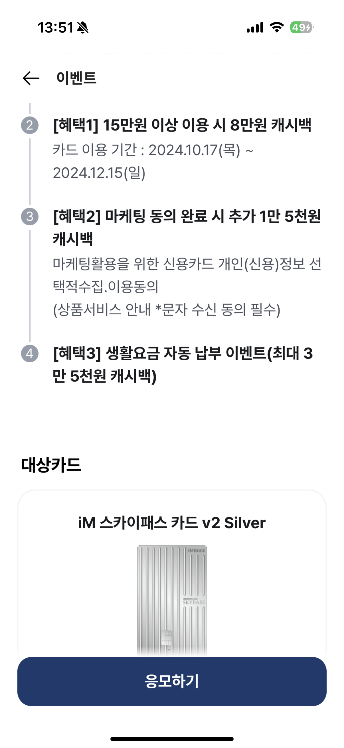 카테고리 없음 IM뱅크 신용카드 이벤트 (13만원 캐시백) by 우루뿡 2024. 10. 18. 728x90 반응형 SMALL 카드 두개 중 연회비가 만 구천원으로 좀 더 저렴한 실버로 발급! 728x90 반응형 LIST 공유하기 게시글 관리 우루뿡 Wuru4