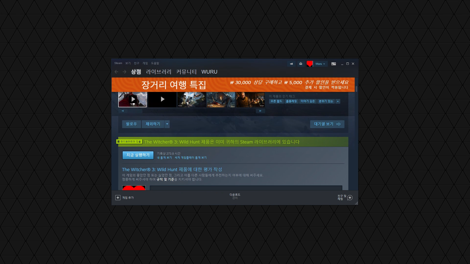 위쳐3는 헤어웍스off/나머지 거의 최상옵 진행 시 프레임드랍이 약간 발생합니다. 지포스 나우 성능에 좀 놀랬습니다.