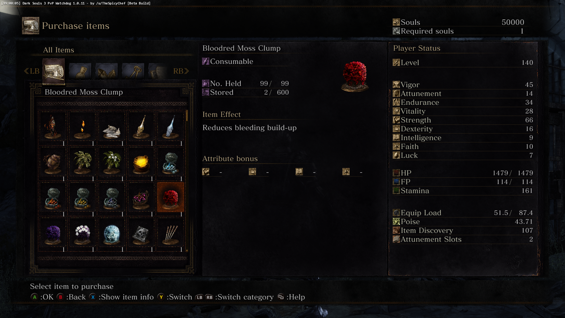각종 소모품, 변질보석, 반지, 마법, 주술, 기적을 1소울에 구입가능합니다( 위영소, 붉은납석, 적안구, 에스트파편 등 )